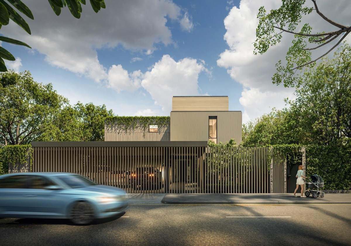 El proyecto se desarrolla en una esquina estratégica, justo donde la calle culmina en una vía sin salida y se encuentra con una avenida importante del sector. Esta situación urbana le otorga presencia, privacidad y una circulación vehicular más calmada para los residentes.