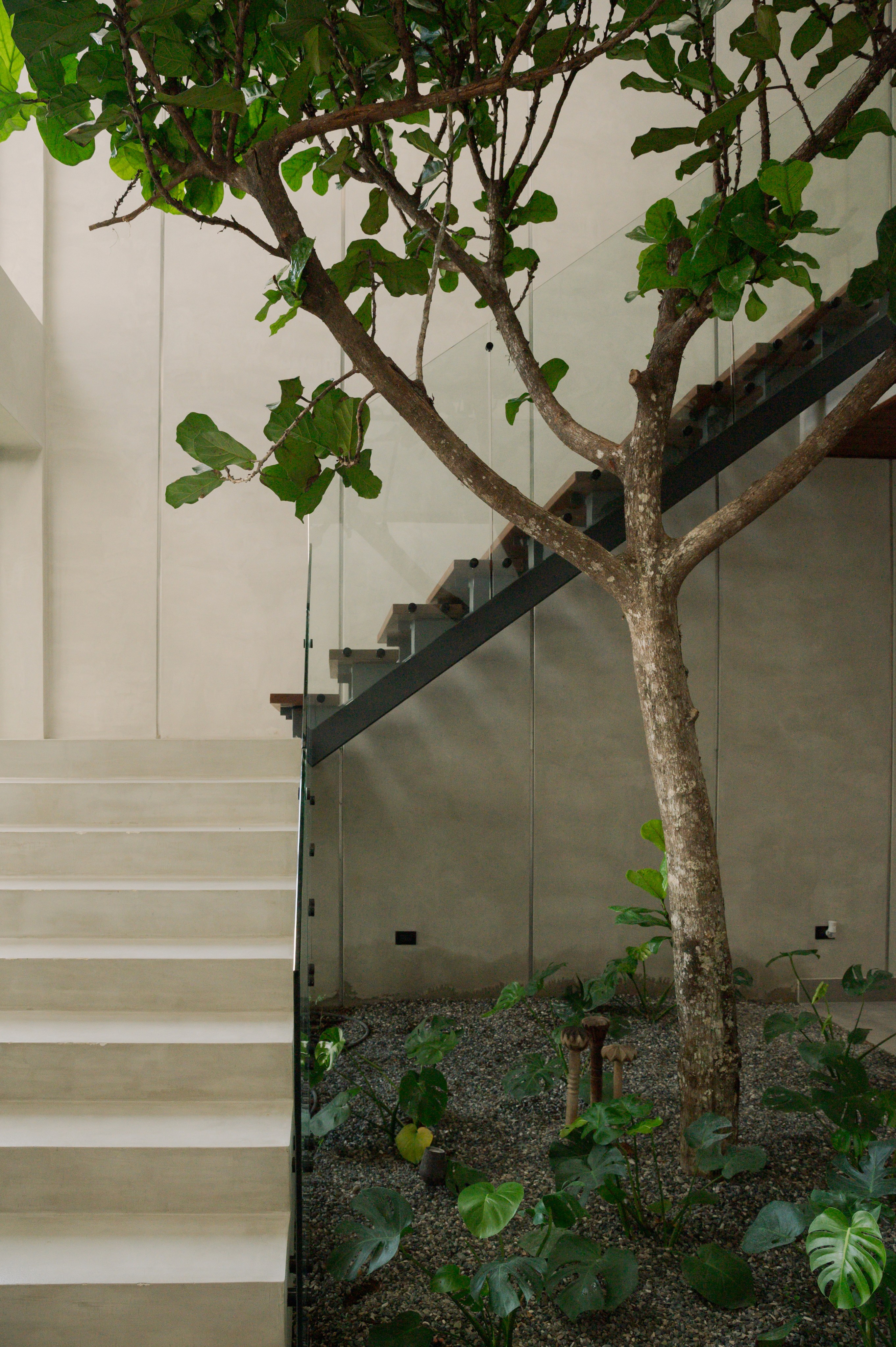 El concreto expuesto y los muros claros actúan como un lienzo neutro que resalta las sombras y el verdor. Su solidez transmite permanencia y serenidad, pero también ofrece un contraste táctil frente a los elementos naturales. En el interior, la continuidad entre pisos, muros y escaleras crea una sensación de fluidez, reforzando la idea de que el espacio no se interrumpe, sino que se adapta a la vida.