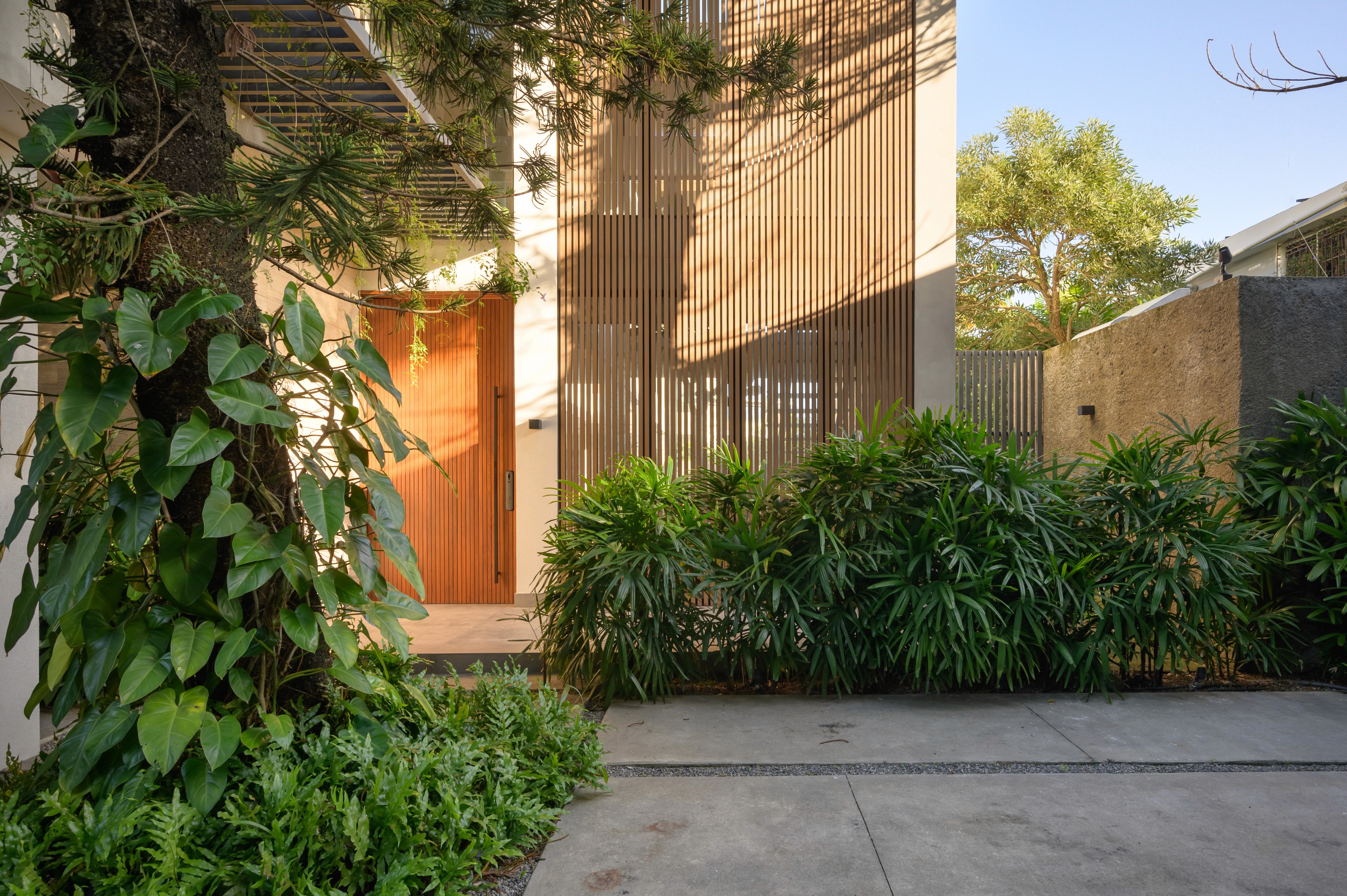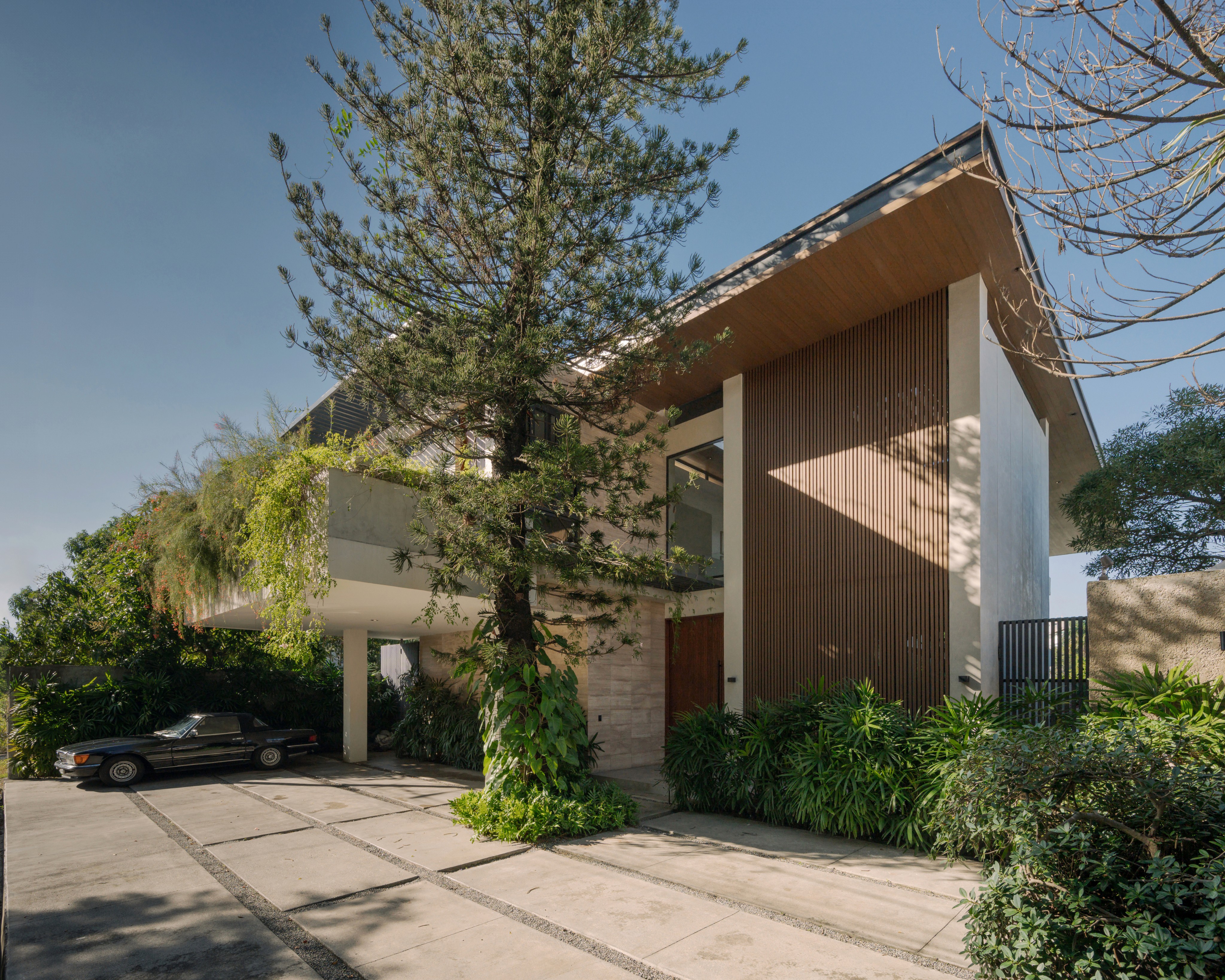 El madera en la fachada y los cielos interiores aporta calidez y ritmo visual. Las lamas verticales controlan la incidencia de la luz tropical, creando una textura cambiante que suaviza la masa del edificio. Este uso de la madera no busca ornamento, sino una conexión orgánica entre lo construido y el entorno vegetal.