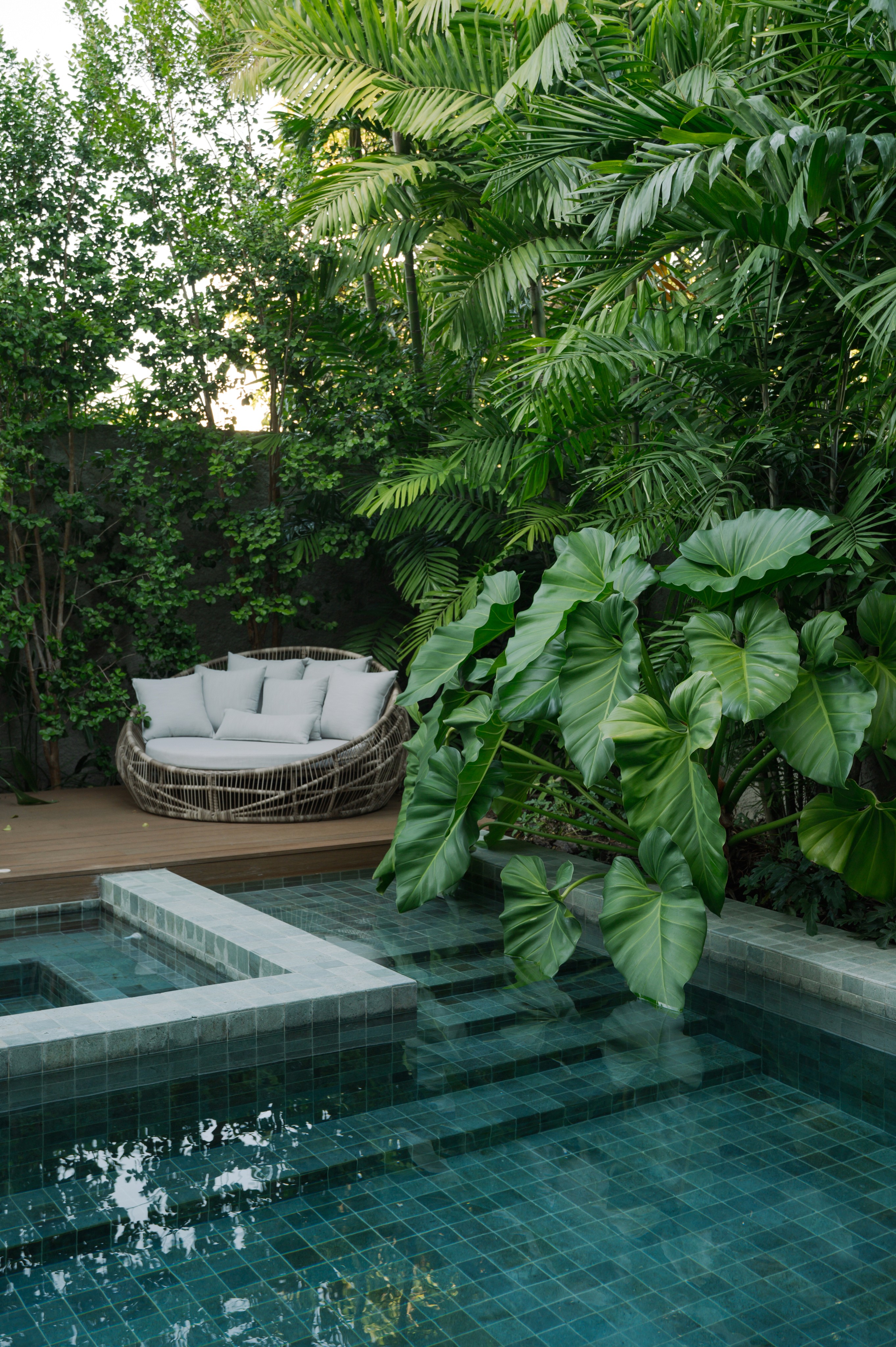 La piscina, revestida con cerámica en tonos verdes y grises, refleja la luz y el follaje que la rodea, creando una atmósfera serena y tropical. La densa vegetación actúa como un límite visual y acústico, aportando privacidad y frescura al entorno.