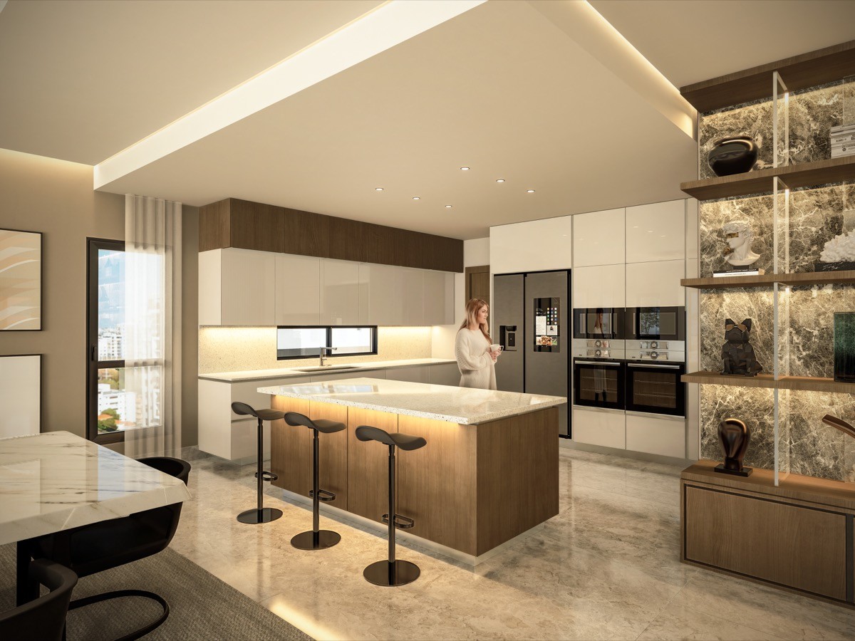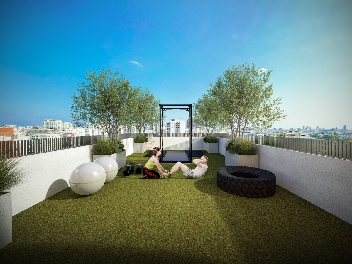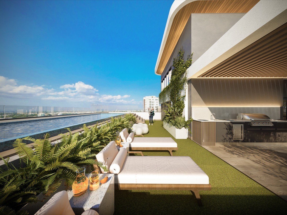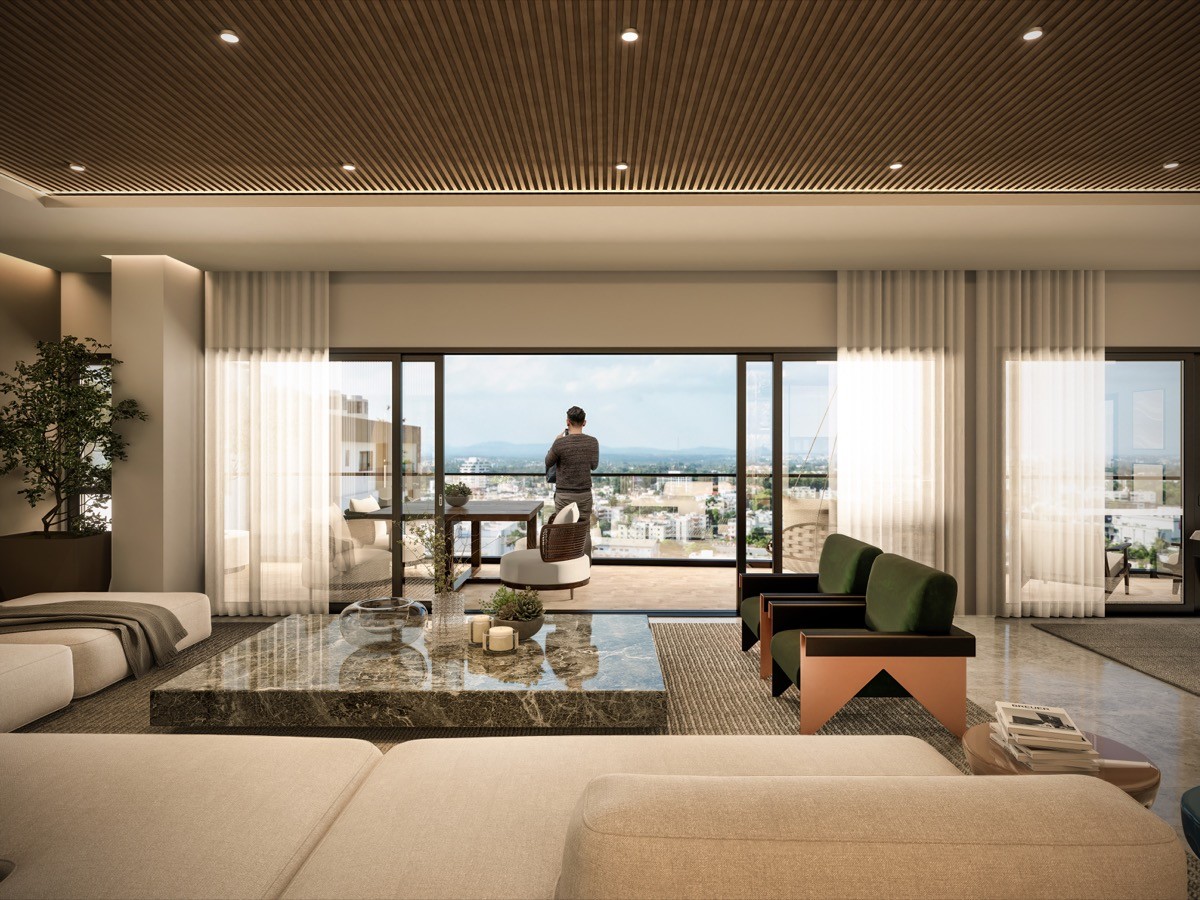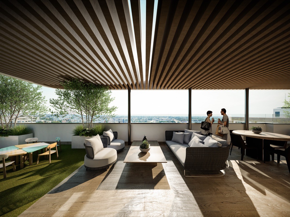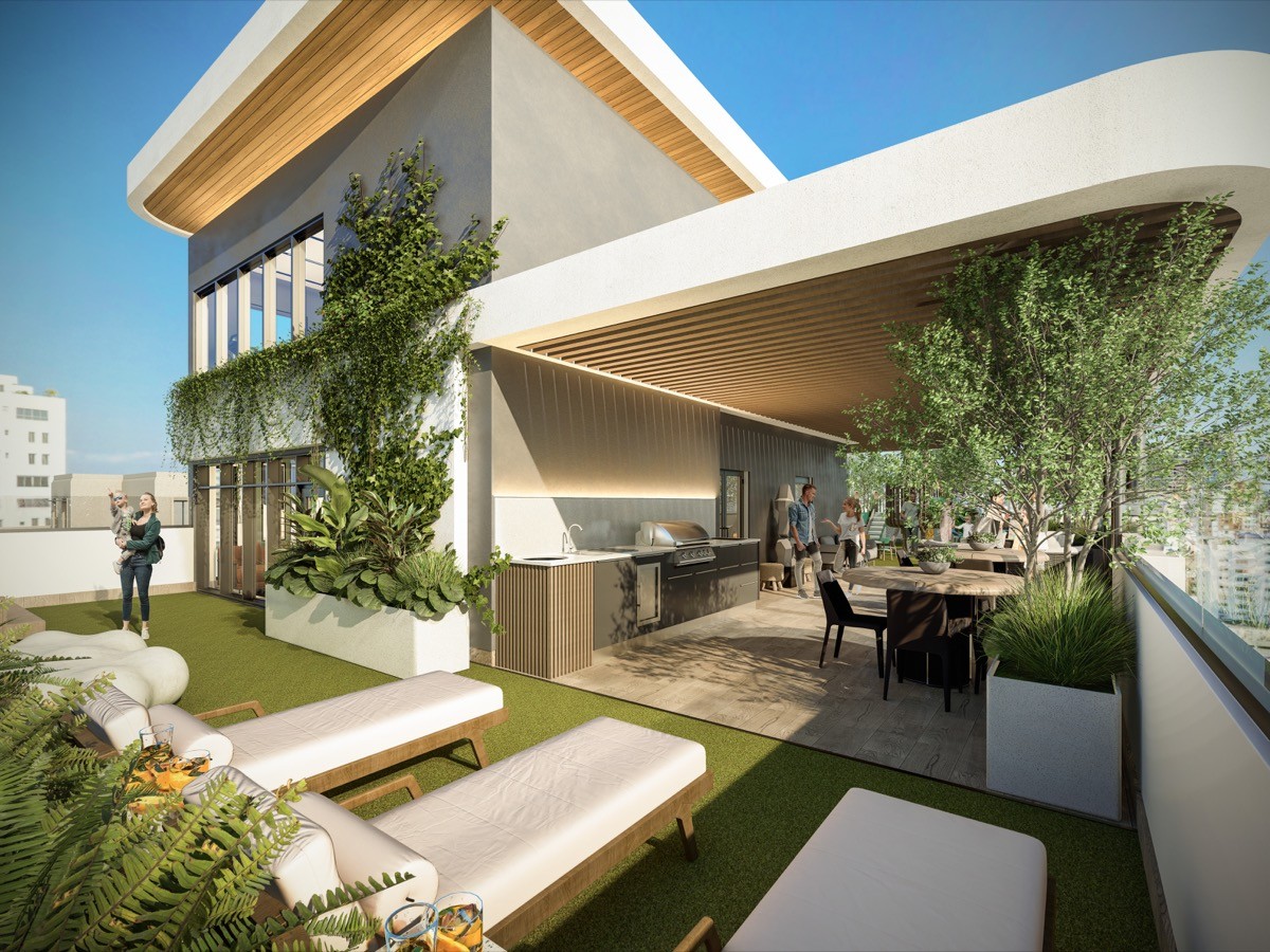 El acceso principal se ubica en la calle Haim López Penha, a pocos metros de la John F. Kennedy, lo que permite una circulación eficiente y rápida hacia los principales ejes de la ciudad. En la planta baja, el proyecto organiza el lobby y los servicios, con conexión directa hacia los parqueos soterrados, que suman 65 espacios distribuidos en niveles subterráneos
