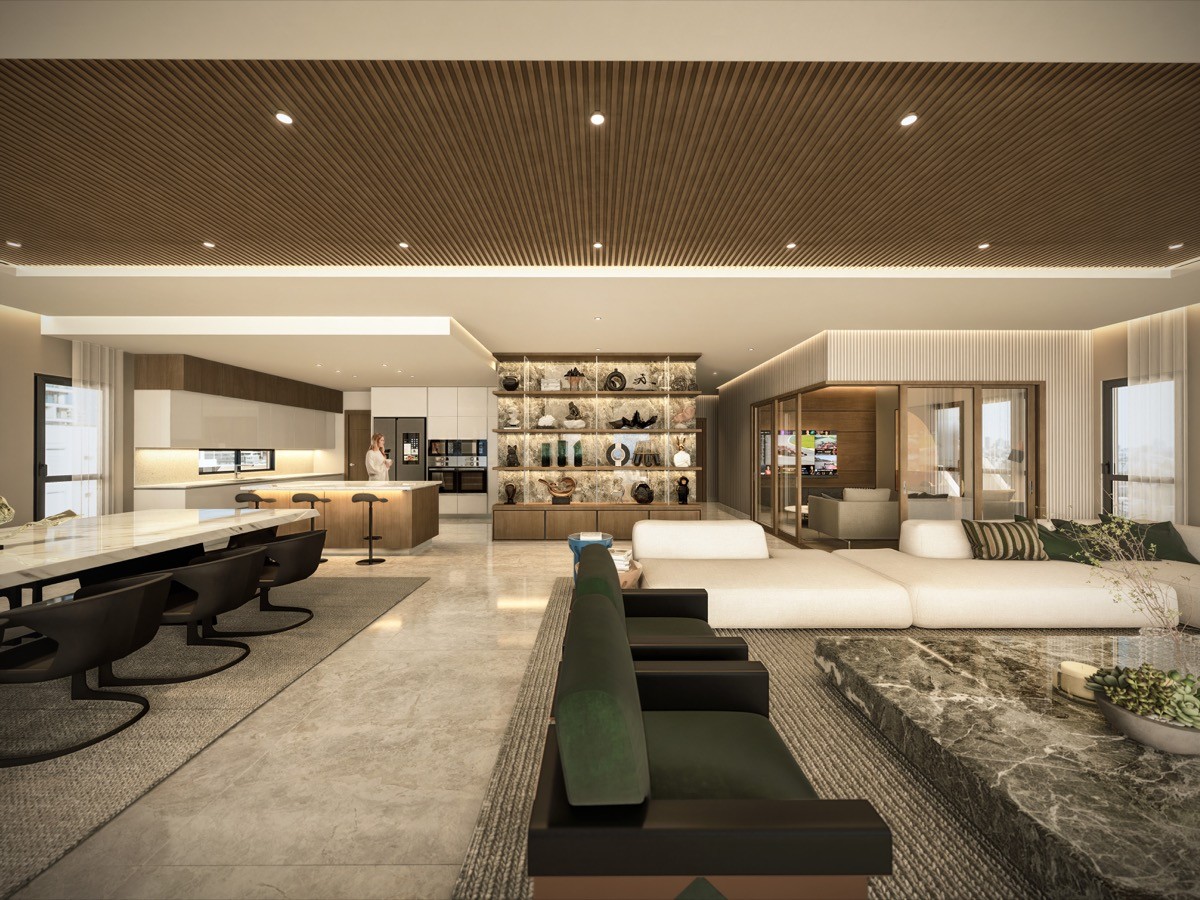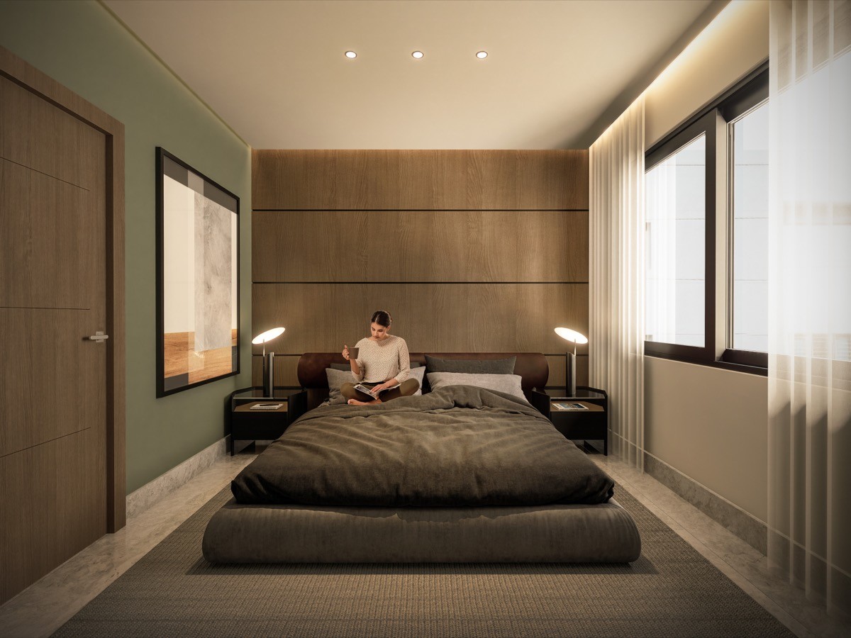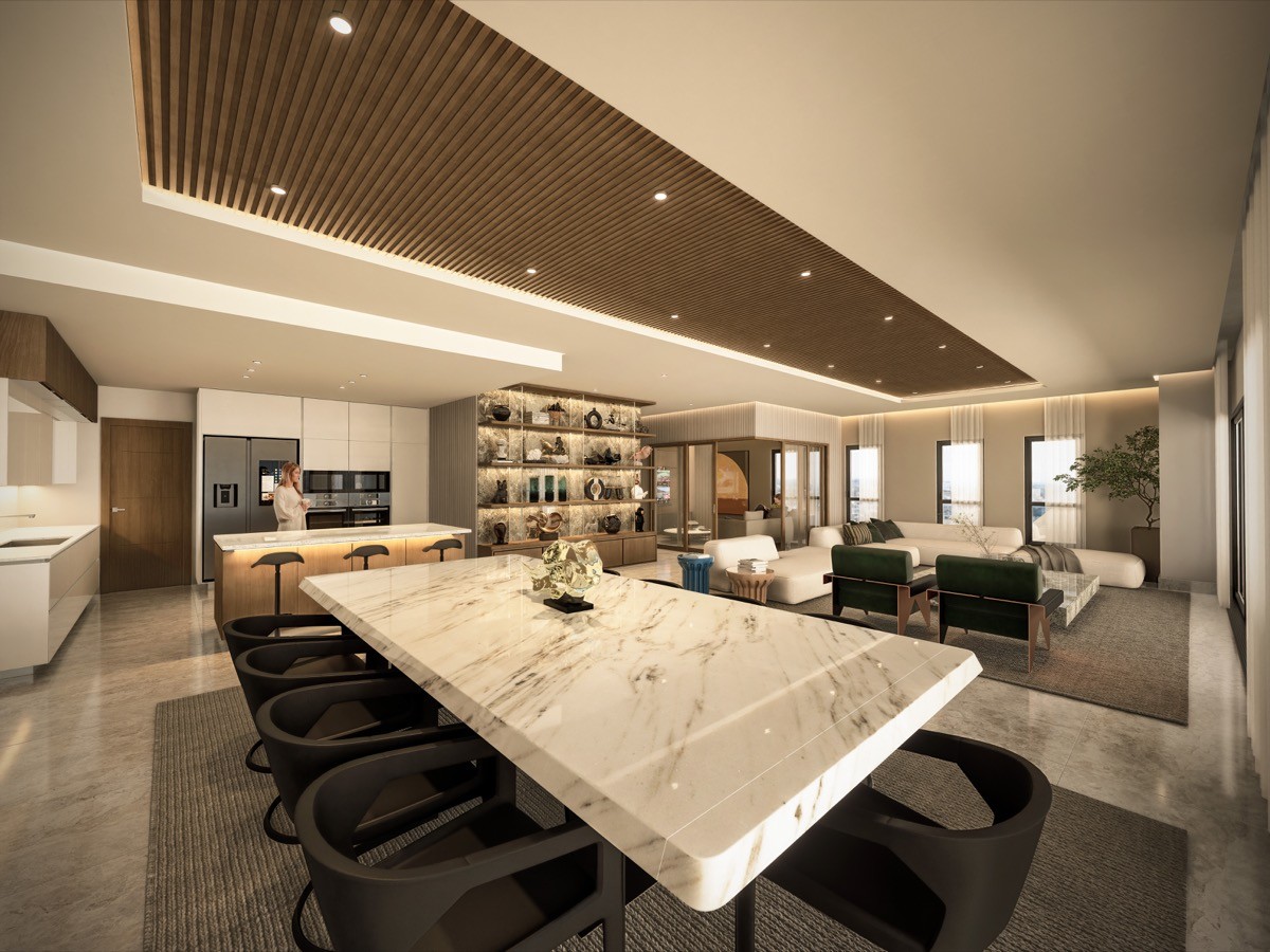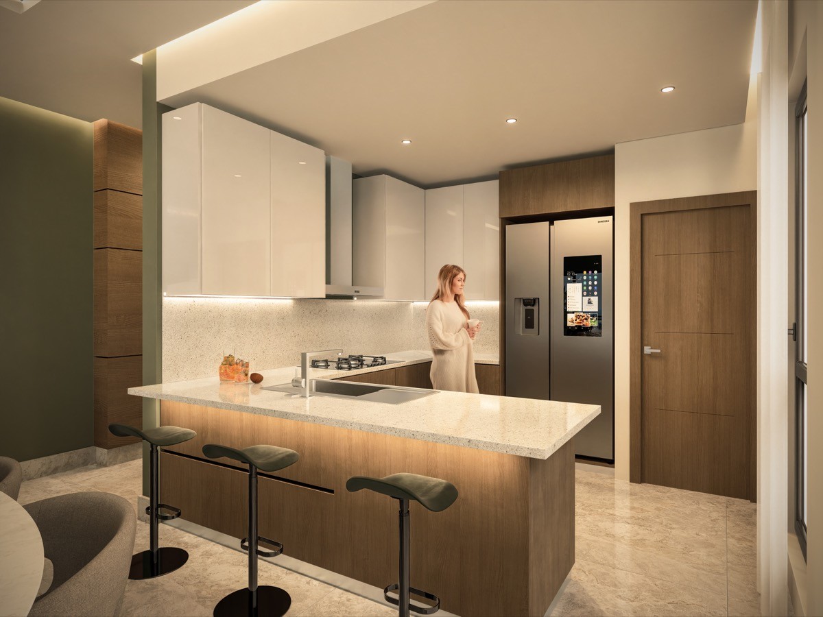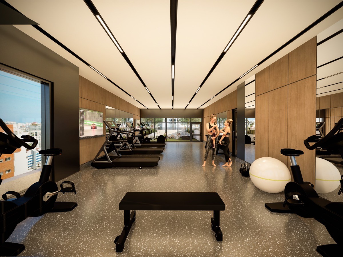 El acceso principal se ubica en la calle Haim López Penha, a pocos metros de la John F. Kennedy, lo que permite una circulación eficiente y rápida hacia los principales ejes de la ciudad. En la planta baja, el proyecto organiza el lobby y los servicios, con conexión directa hacia los parqueos soterrados, que suman 65 espacios distribuidos en niveles subterráneos