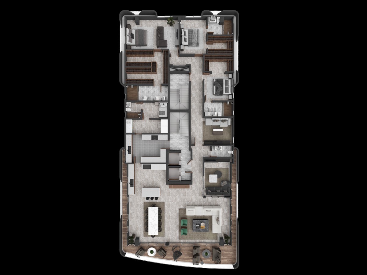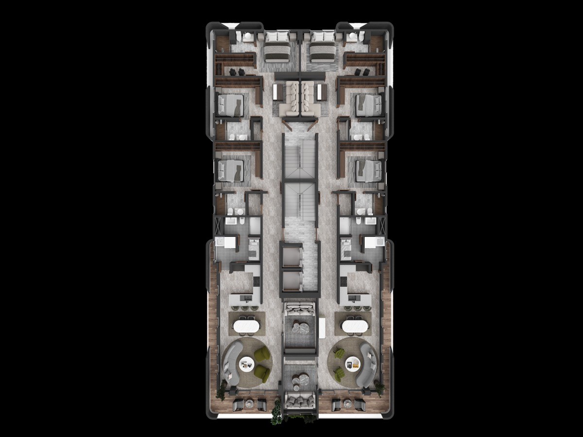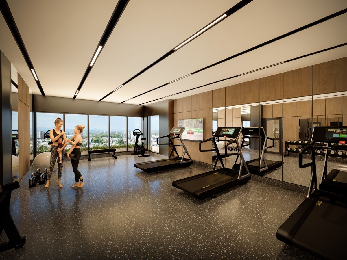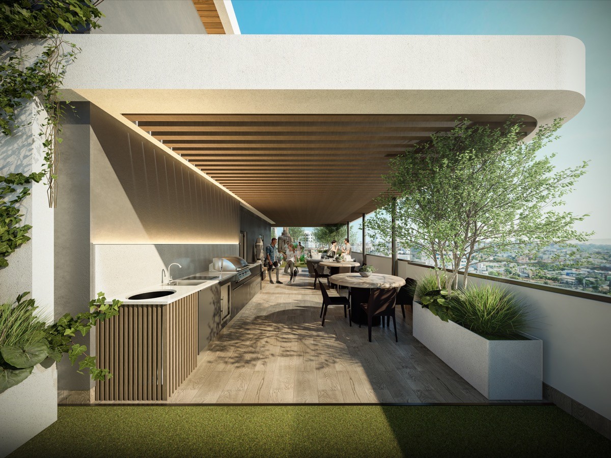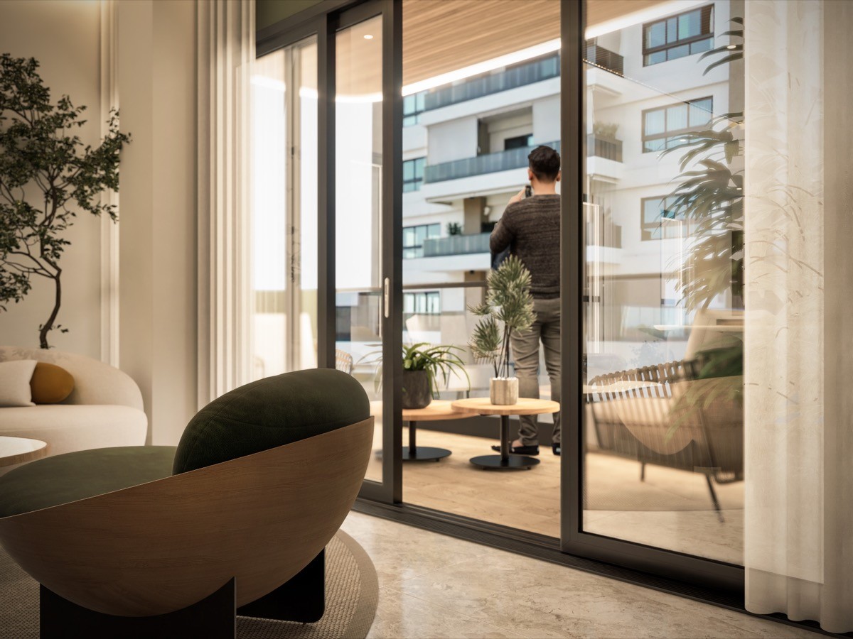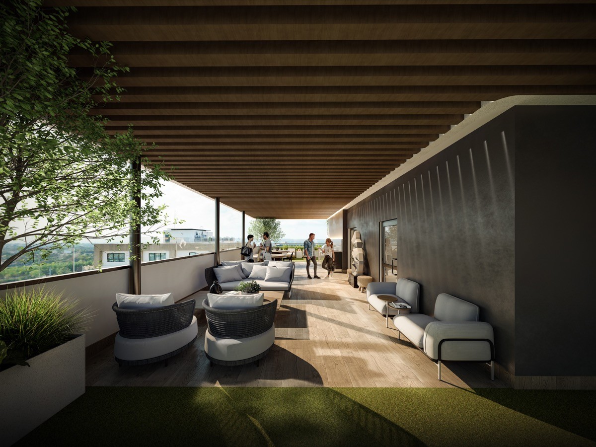 El acceso principal se ubica en la calle Haim López Penha, a pocos metros de la John F. Kennedy, lo que permite una circulación eficiente y rápida hacia los principales ejes de la ciudad. En la planta baja, el proyecto organiza el lobby y los servicios, con conexión directa hacia los parqueos soterrados, que suman 65 espacios distribuidos en niveles subterráneos