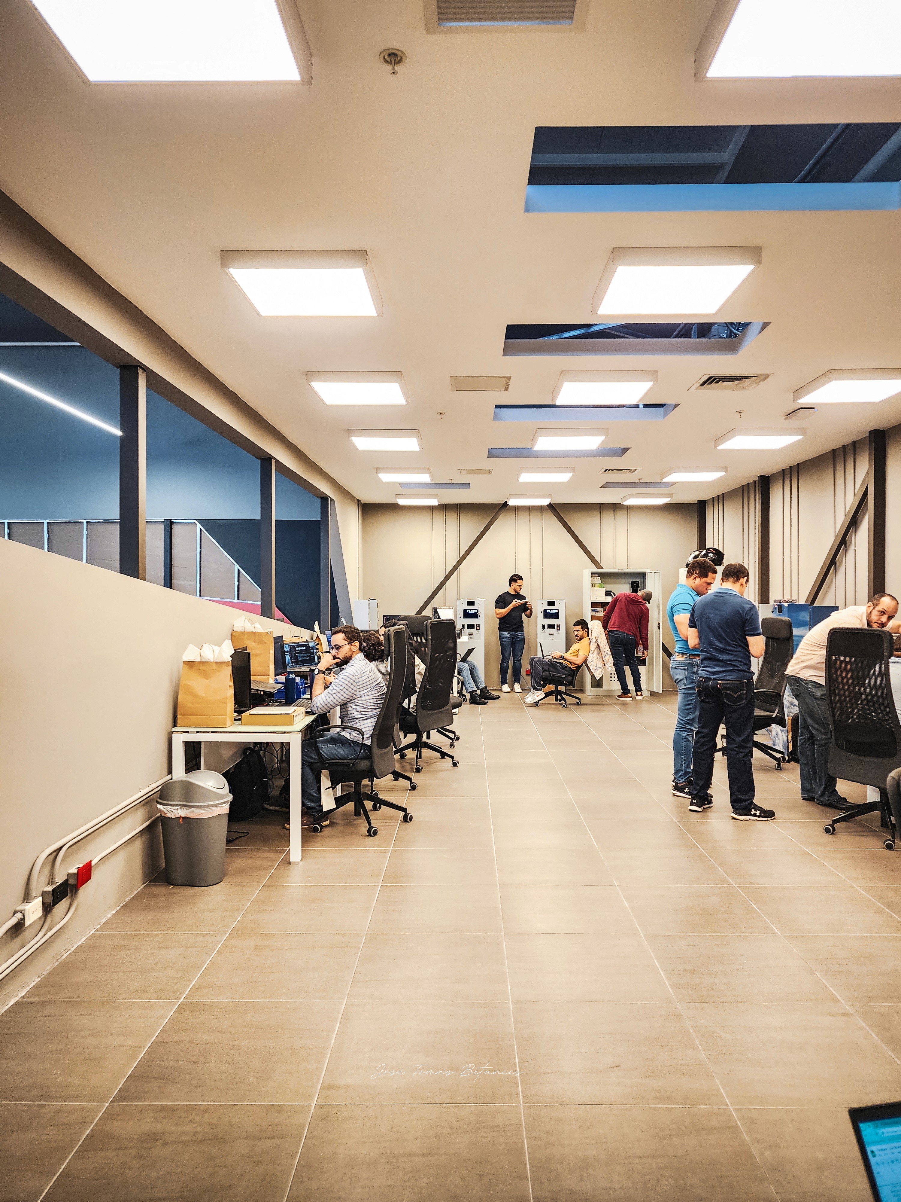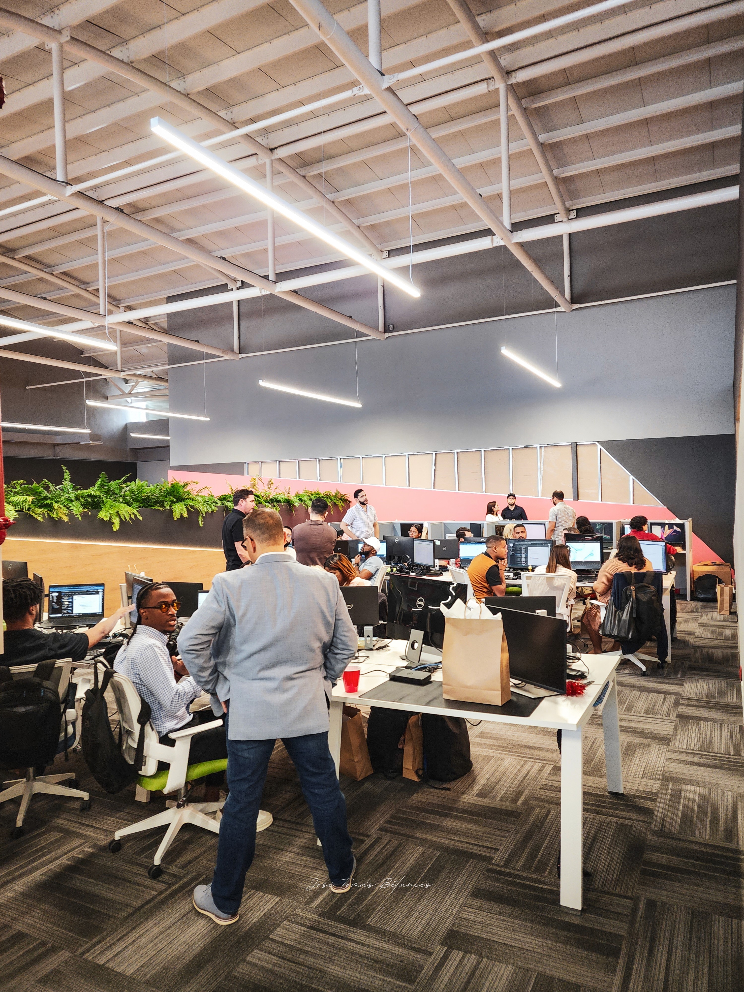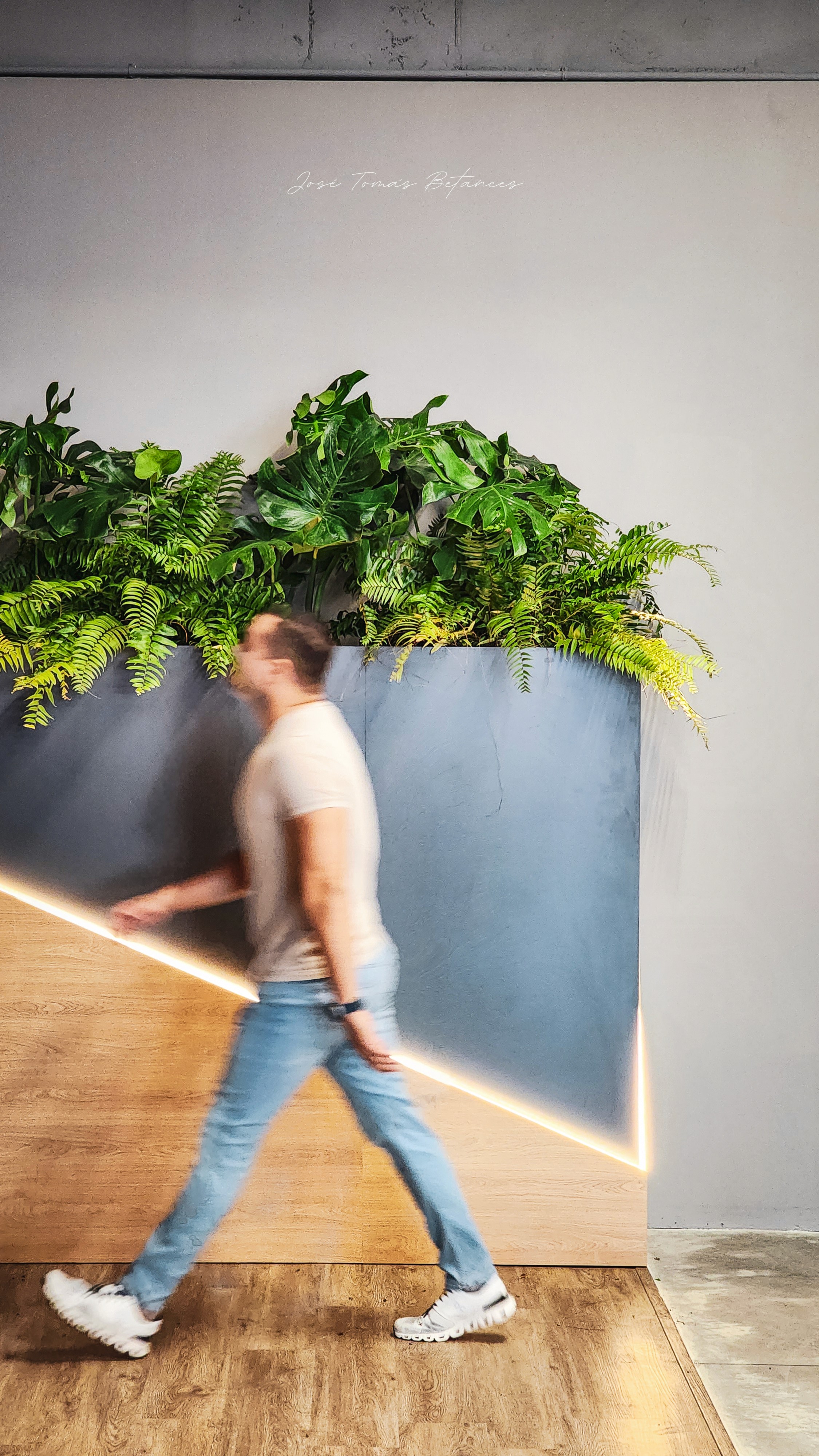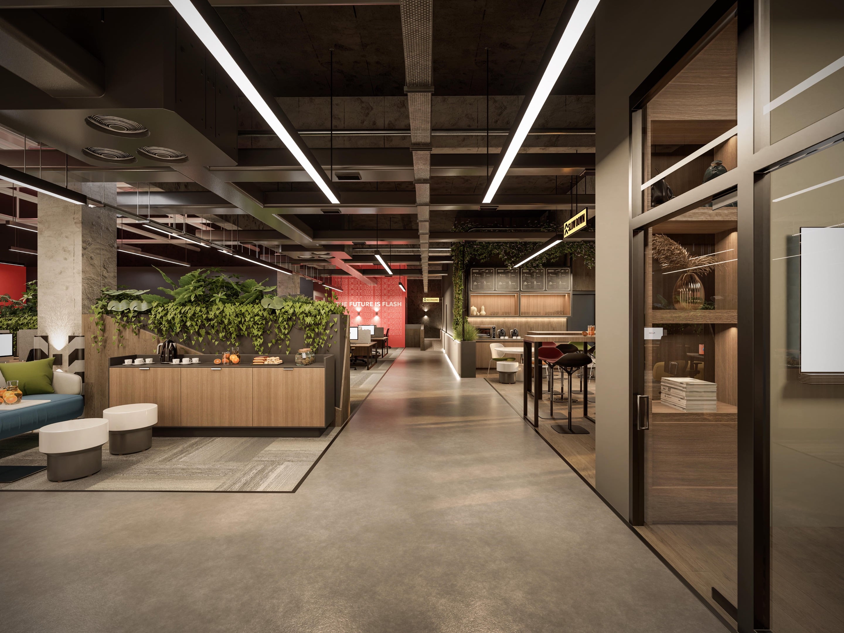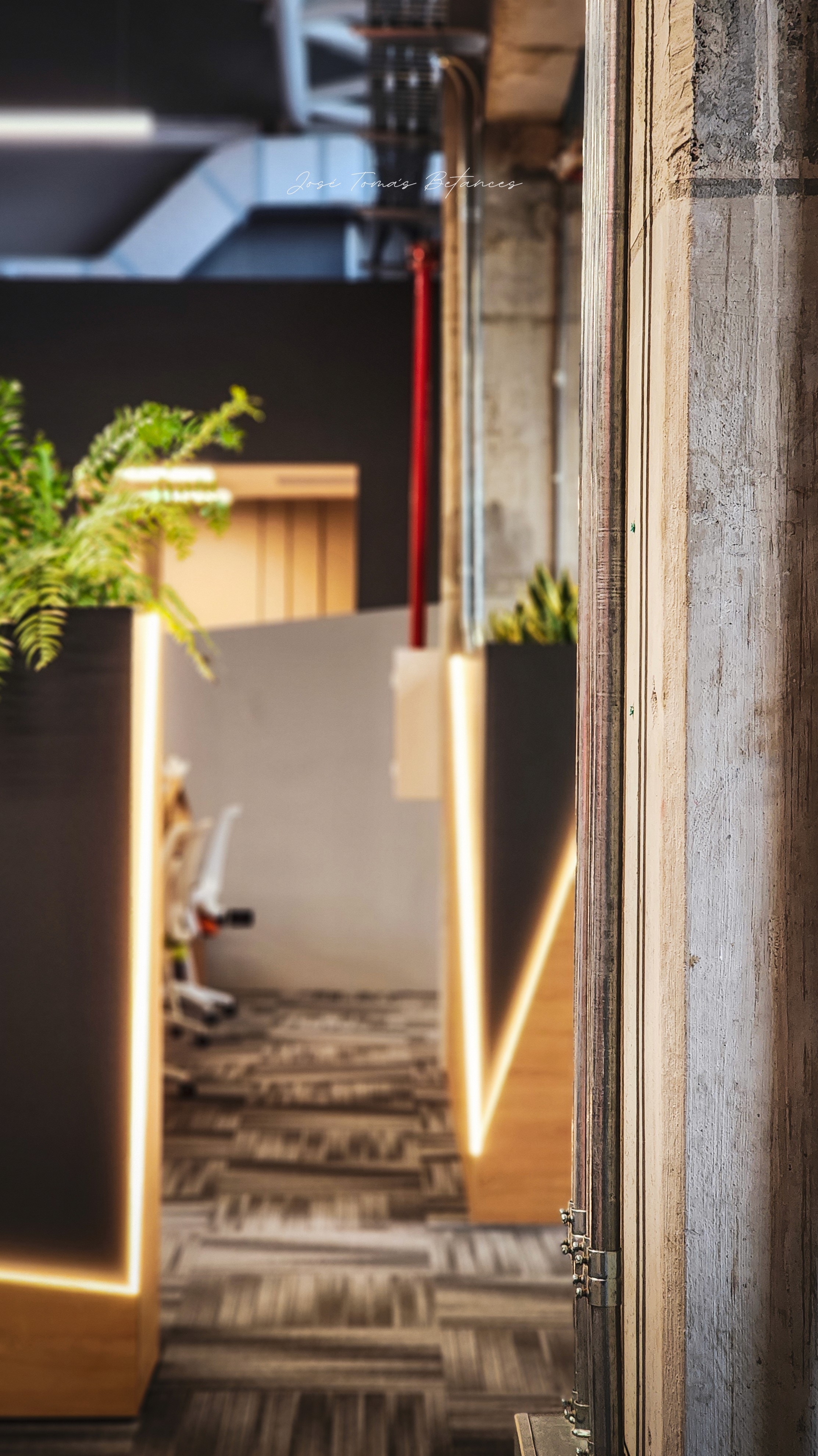 La arquitectura interior establece un lenguaje claro: superficies limpias, concreto expuesto y detalles en madera que aportan calidez sin perder sobriedad. La paleta cromática se mantiene controlada para reforzar concentración y orden. Los cerramientos de vidrio permiten que la iluminación llegue a las zonas profundas y refuerzan la idea de transparencia operativa, una cualidad que refleja la cultura del cliente.