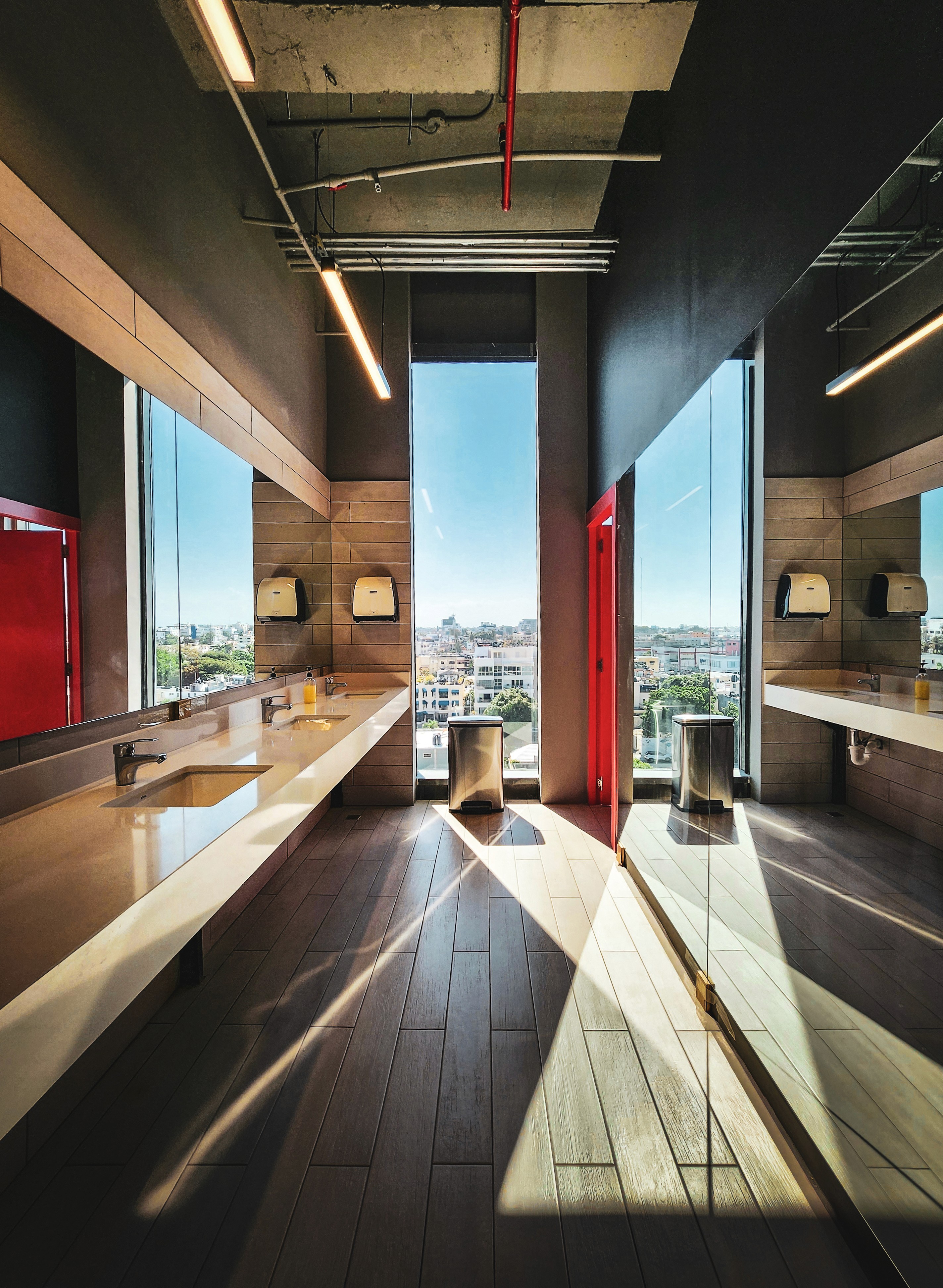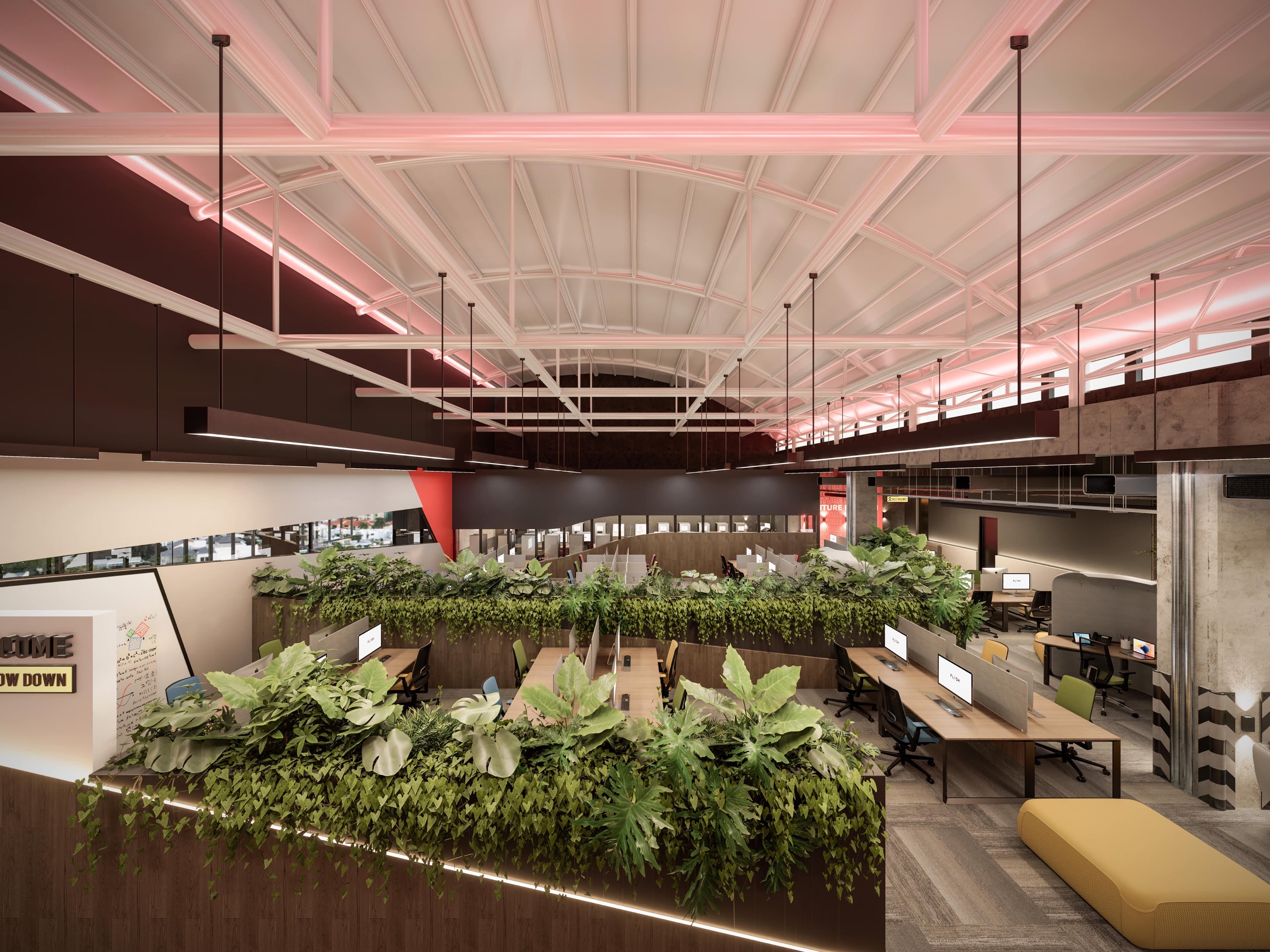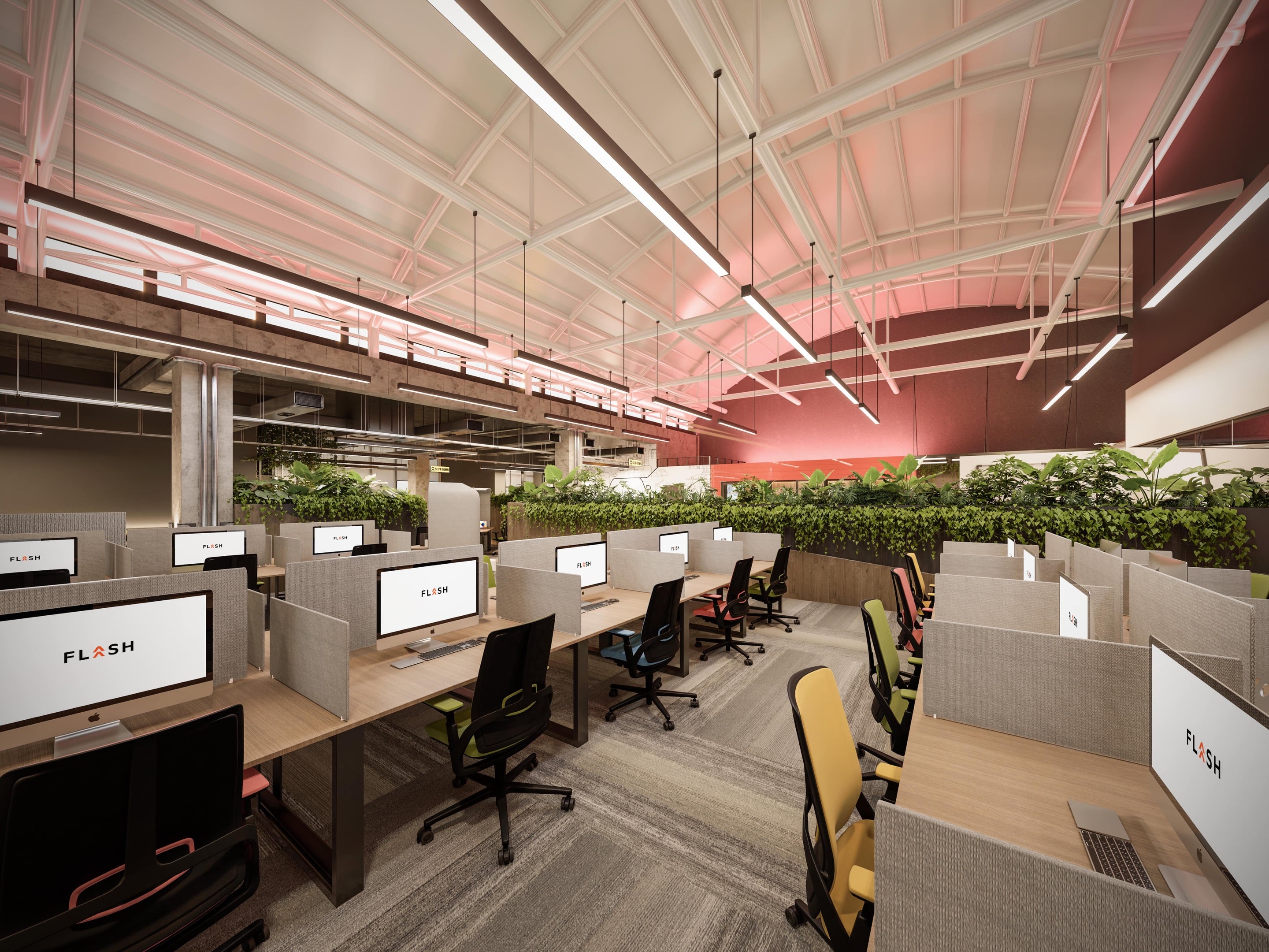 El proyecto organiza el interior a partir de una idea simple: crear un ambiente laboral que no se sienta encerrado. Para lograrlo, se trabajó con luz natural, ventilación cruzada y una selección de materiales que remiten al exterior urbano donde opera la compañía. La geometría existente del techo curvo se mantuvo como elemento principal y se utilizó para generar amplitud y continuidad visual en todas las áreas.